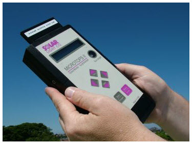 The Microtops II sun photometer is a 5 channel (440nm, 675nm, 870nm, 936nm, 1020nm), hand-held instrument for measuring the direct solar radiance using a 2.5° viewing angle. The Microtops II has been configured with five filters for the determination of aerosol optical thickness (AOT), including filters at 936nm and 1020nm for the measurement of the precipitable water vapour content. Additionally it contains a non-volatile memory allowing associating date, time, coordinates, solar angle, altitude, pressure and temperature to each data point. [1]